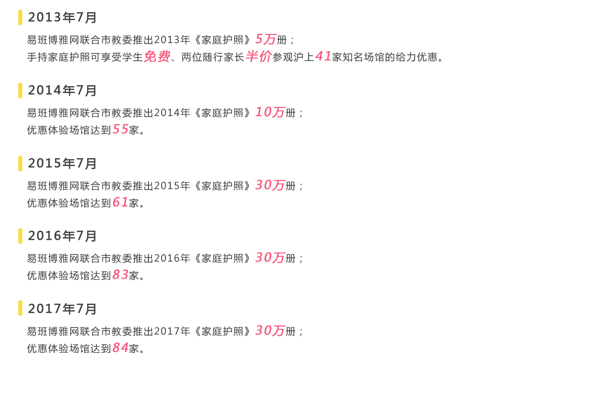 易班博雅网连续5年作为《家庭护照》官方指定发放平台,每年全市共计发放30万册,优惠体验场馆达到84家。